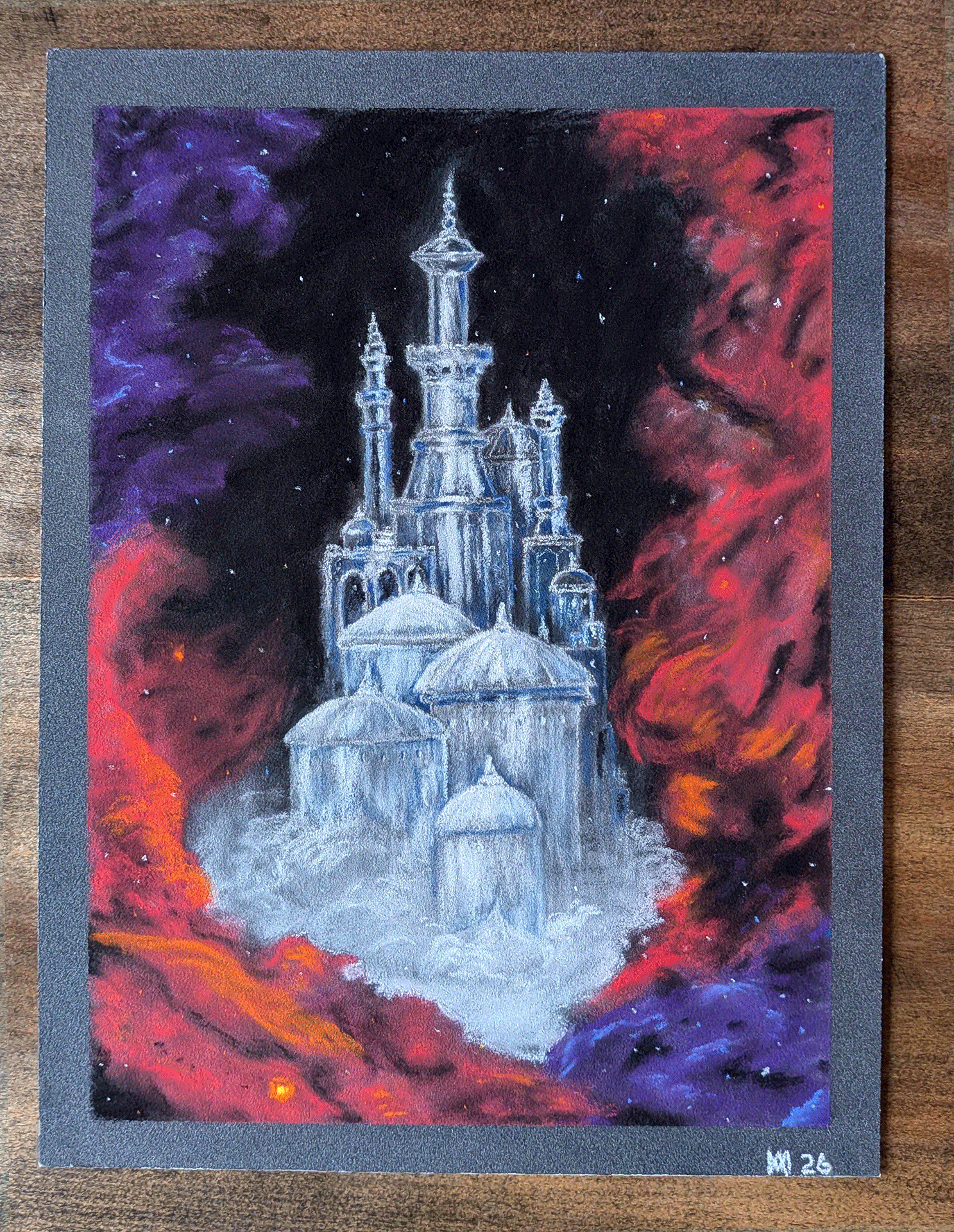 Fast forward to the present. The artist behind Nightjar Illustration, Adam Burke, is one of my inspirations. I love Adam's work, and was overjoyed to discover he is contributing artwork to a card game I've been playing. Upon seeing his artwork for the promotional version of a card, City of Glass, I was captivated in the same way as I was by Rebecca's artwork almost a decade ago. Despite knowing Adam's City of Glass was done with acrylics, the two wires crossed. I wanted to make an homage to Adam's piece, and thought the dreamy aesthetics of soft pastels would make a great fit. I dredged up that box of eight sticks again. This time, with a clear goal in mind, I set out.